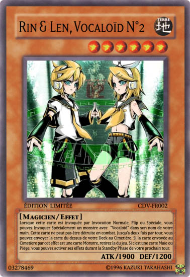 Me revoila pour ma seconde Funcard, autrement dit la seconde carte de mon Set "Choeur des Vocaloïd" ! Cette fois, j'ai l'insigne honneur de vous présenter Rin & Len, les Vocaloïd jumeaux portant le numéro 2 (comme leur nom l'indique).