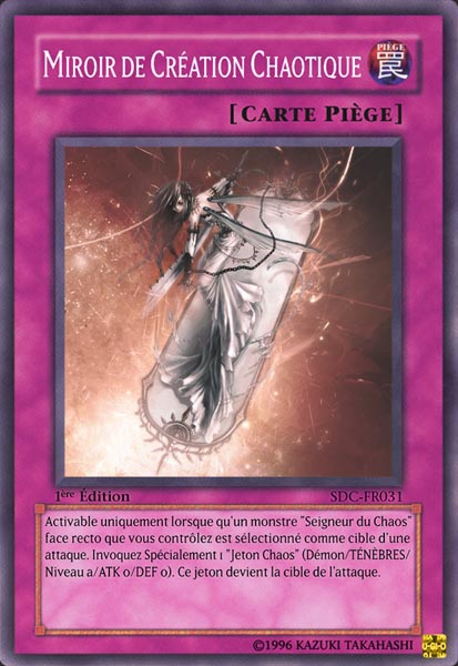 ¤ Je vois pas vraiment ce que je peux dire... Miroir, parce qu'il y a une miroir. Création, parce qu'y a une fille qui sort du miroir (et qui fonce comme un troll épée à la main ! Yeah ! è__é *sors*). Et Chaotique... Parce que le FunDeck s'intitule "Seigneur du Chaos", après tout...