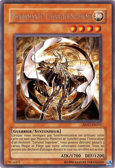 Voici donc Rhadamante, Chevalier Suprême, bien sur issu de mon set Apocalypse Antique. Si vous avez suivi le déroulement de mon set avec attention, vous verrez que Sephiroth porte la mention Guerrier Suprême, et non Chevalier Supême...