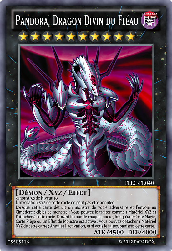 Idée/Originalité/Créativité : EXTRÊMEMENT cheaté :3 Mais deux contrecoups intéressants : le fait d'avoir deux monstres niv.10 sur le Terrain, et bannir la carte si elle utilise son deuxième effet... Mais cheaté quand même ^^' Imagine qu'il existe un tel monstre et qu'il puisse être utilisable :3 Mais je trouve l'effet de la carte très réaliste. Ce qui me gène (j'allais mettre 20, tu vas m'en vouloir), c'est le titre de la carte. Okay c'est un dragon, okay il fait mal -> fléau mais... Pandora, 10 000 fois utilisé, Dragon DIVIN du Fléau, le divin est de trop... On a trop de truc cheatés et divins maintenant... Alors ce sera 19 pour moi :3