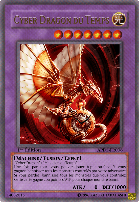 Me revoilà avec une toute nouvelle FunCard, le Cyber Dragon du Temps ! L'idée m'est bien entendue venue des deux cartes concernées pour la fusion : le Magicien du Temps et le Cyber Dragon !