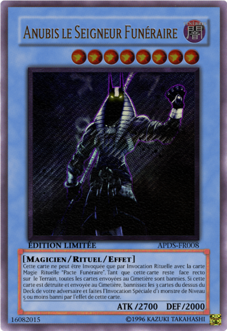 A savoir que je me suis inspiré de ma carte Rituelle préférée (avec Peine, Roi de l'Armaguedon), donc j'espère qu'elle vous plait, je trouvais que Anubis était le monstre parfait pour une carte Rituelle !