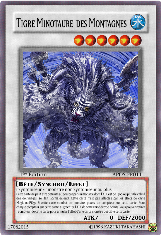 J'ai abandonné l'effet de rareté sur le titre pour amener des cartes communes dans mon set quand même. Je l'ai bien placé normalement. Idem pour l'attribut EAU, qui est bien plus petit que les autres attributs. J'ai hésité à mettre TERRE mais comme il fait de la neige ce tigre j'ai préféré garder l'eau et en plus je n'avais pas encore fait de monstre EAU.