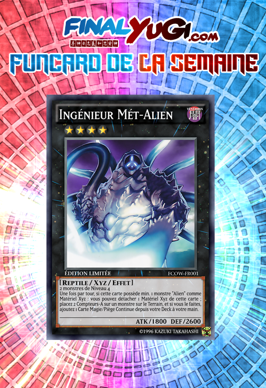 Une fois par tour, si cette carte possède un monstre "Alien" comme Matériel Xyz : vous pouvez détacher un Matériel Xyz de cette carte : placer 2 Compteurs-A sur un monstre sur le Terrain et si vous le faites, ajoutez 1 Carte Magie/Piège Continue de votre Deck à votre main.