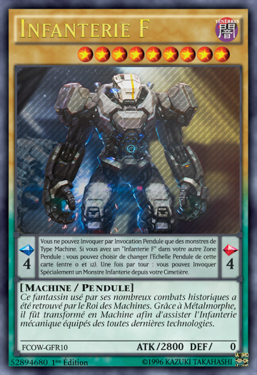 [Effet Pendule : Vous ne pouvez Invoquer par Invocation Pendule que des monstres de Type Machine. Si vous avez un "Infanterie F" dans votre autre Zone Pendule : vous pouvez choisir de changer l'Echelle Pendule de cette carte (entre 0 et 12). Une fois par tour : vous pouvez Invoquer Spécialement un Monstre Infanterie depuis votre Cimetière.