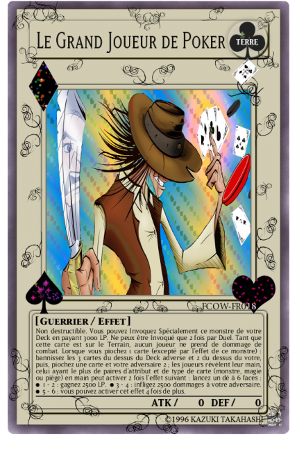 Dès que vous piochez une carte, piochez en une autre et votre adversaire en pioche 2. Bannissez les trois cartes du dessus du deck adverse et deux posez en deux de votre deck dans votre zones carte bannie ( je sais quelle n'existe pas mais bon les cartes sont en votre possessions ) puis dévoilez les , les deux joueurs montre les deux carte piochées ,le joueur ayant le plus de paires d?attribut, de type de carte, si il y a égalité de niveaux de monstre total est compté comme le vainqueur , le vainqueur peut activer deux de ces effets en lançant deux dés six :