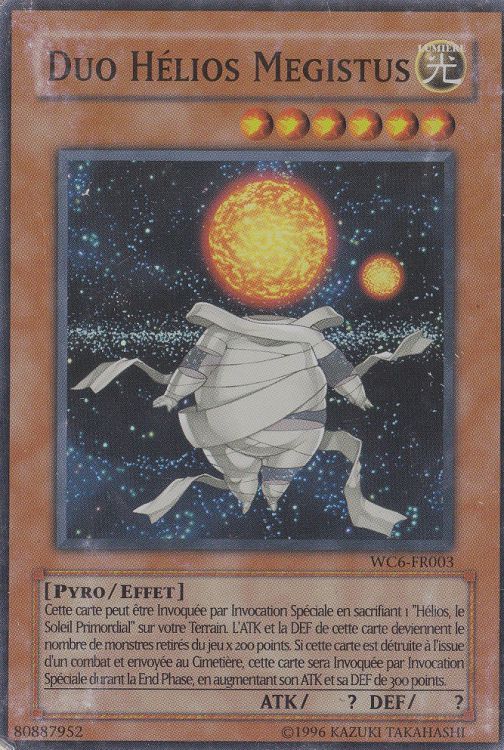 Vous pouvez Invoquer Spécialement cette carte en Sacrifiant 1 "Hélios, le Soleil Primordial". l'ATK et la DEF de cette carte sont égales au nombre de monstres retirés du jeu X 200. Si cette carte est détruite au combat et envoyée au Cimetière, Invoquez-la Spécialement durant la End Phase, et elle gagne 300 points d'ATK et de DEF.