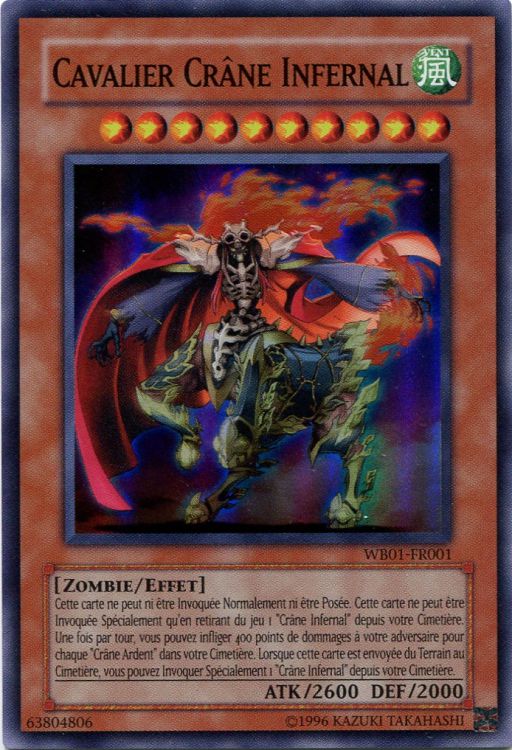 Cette carte ne peut pas être Invoquée Normalement ou Posée. Cette carte peut seulement être Invoquée Spécialement en retirant du jeu 1 "Crâne Infernal" de votre Cimetière. Une fois par tour, vous pouvez infliger 400 points de dommage à votre adversaire pour chaque "Crâne Ardent" dans votre Cimetière. Lorsque cette carte est envoyée du terrain au Cimetière. Vous pouvez Invoquer Spécialement 1 "Crâne Infernal" depuis le Cimetière.