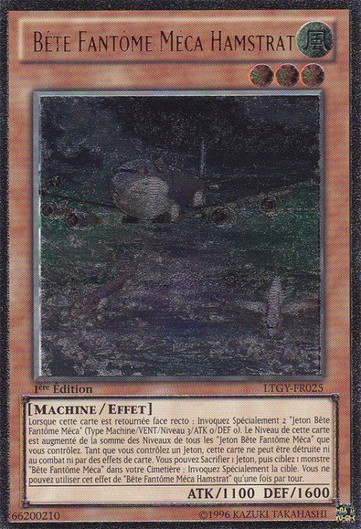 Lorsque cette carte est retournée face recto : Invoquez Spécialement 2 "Jeton Bête Fantôme Méca" (Type Machine/VENT/Niveau 3/ATK 0/DEF 0). Le Niveau de cette carte est augmenté de la somme des Niveaux de tous les "Jeton Bête Fantôme Méca" que vous contrôlez. Tant que vous contrôlez un Jeton, cette carte ne peut pas être détruite ni au combat ni par des effets de carte. Vous pouvez Sacrifier 1 Jeton, puis ciblez 1 monstre "Bête Fantôme Méca" dans votre Cimetière ; Invoquez Spécialement la cible. Vous ne pouvez utiliser cet effet de "Bête Fantôme Méca Hamstrat" qu'une fois par tour.