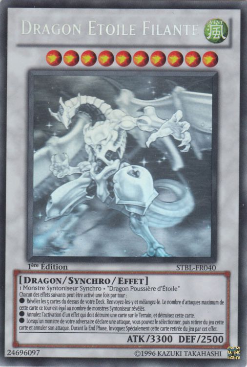1 Monstre Syntoniseur Synchro + "Dragon Poussière d'Étoile" Chacun des effets suivants ne peut être activé qu'une seule fois par tour : - Révélez les 5 cartes du dessus de votre Deck. Renvoyez-les au Deck et mélangez-le. Le nombre d'attaques que cette carte peut faire durant chaque Battle Phase ce tour est égal au nombre de monstres Syntoniseur révélés par cet effet. - Lorsqu'un effet qui est activé doit détruire une carte sur le Terrain, vous pouvez annuler cet effet et détruire cette carte. - Lorsqu'un monstre de votre adversaire déclare une attaque, vous pouvez retirer du jeu cette carte du jeu, sélectionner le monstre attaquant et annuler son attaque. Durant la End Phase, Invoquez Spécialement cette carte retirée du jeu par cet effet.