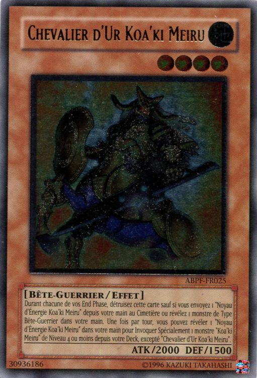 Durant chacune de vos End Phases, détruisez cette carte sauf si vous envoyez 1 "Noyau d'Énergie Koa'ki Meiru" depuis votre main au Cimetière ou révélez 1 monstre de Type Bête-Guerrier dans votre main. Une fois par tour, vous pouvez révéler 1 "Noyau d'Énergie Koa'ki Meiru" dans votre main pour Invoquer Spécialement 1 monstre "Koa'ki Meiru" de Niveau 4 ou moins depuis votre Deck, excepté "Chevalier d'Ur Koa'ki Meiru".