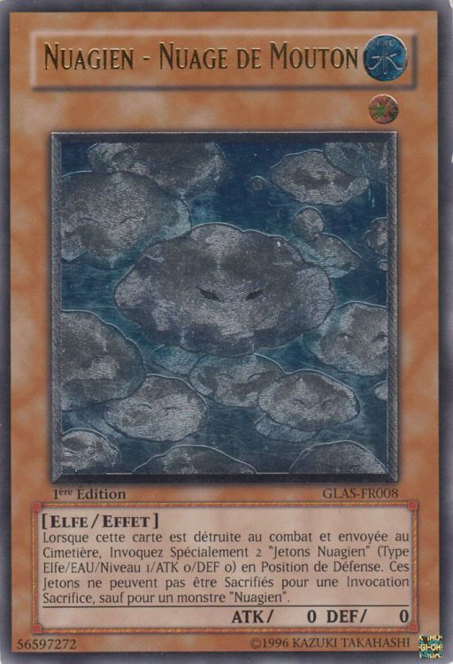 Lorsque cette carte est détruite au combat et envoyée au Cimetière, Invoquez Spécialement 2 "Jetons Nuagien" (Type Elfe/EAU/Niveau 1/ATK 0/DEF 0) en Position de Défense. Ces Jetons ne peuvent pas être Sacrifiés pour une Invocation Sacrifice, sauf pour un monstre "Nuagien".