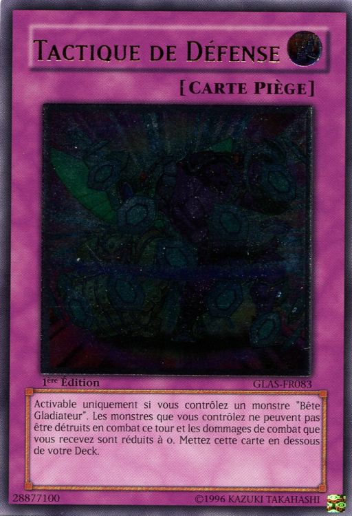Activable uniquement si vous contrôlez un monstre "Bête Gladiateur". Les monstres que vous contrôlez ne peuvent pas être détruits en combat ce tour et les dommages de combat que vous recevez sont réduits à 0. Mettez cette carte en dessous de votre Deck.