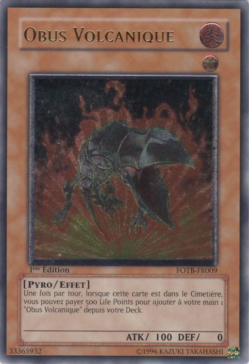 Une fois par tour, lorsque cette carte est dans le Cimetière, vous pouez payer 500 Life Points pour ajouter à votre main 1 'Obus Volcanique' de votre Deck.
