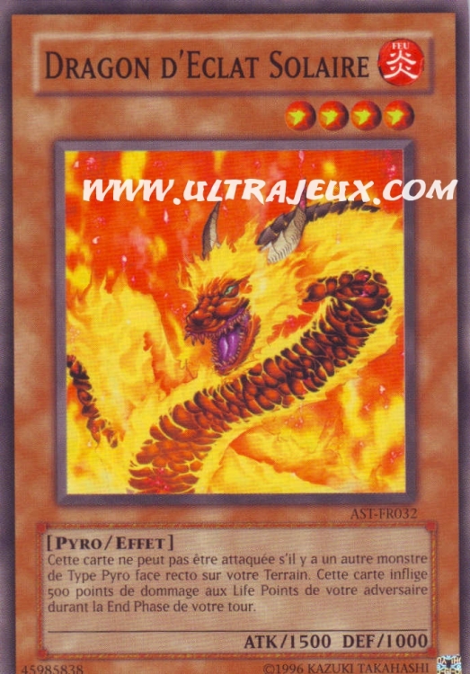 Cette carte ne peut pas être attaquée s'il y a un autre monstre de Type Pyro sur votre Terrain. Cette carte inflige 500 points de Dommages aux Life Points de votre adversaire lors de la End Phase de votre tour.