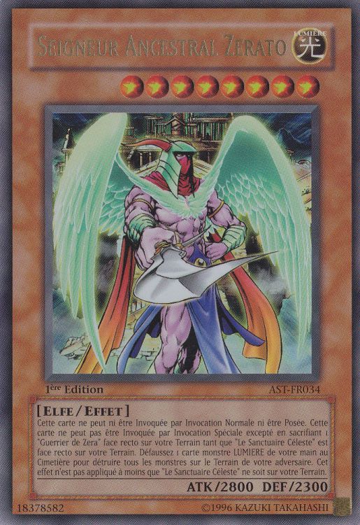 Cette carte ne peut pas être Invoquée Normalement ou Posée. Cette carte ne peut pas être Invoquée Spécialement sauf en sacrifiant 1 "Warrior of Zera" face recto sur votre Terrain alors que "The Sanctuary in the Sky" est sur le Terrain. Si "The Sanctuary in the Sky" est sur votre Terrain, défaussez-vous d'1 Carte Monstre LUMIERE de votre main pour détruire tous les monstres sur le Terrain adverse.