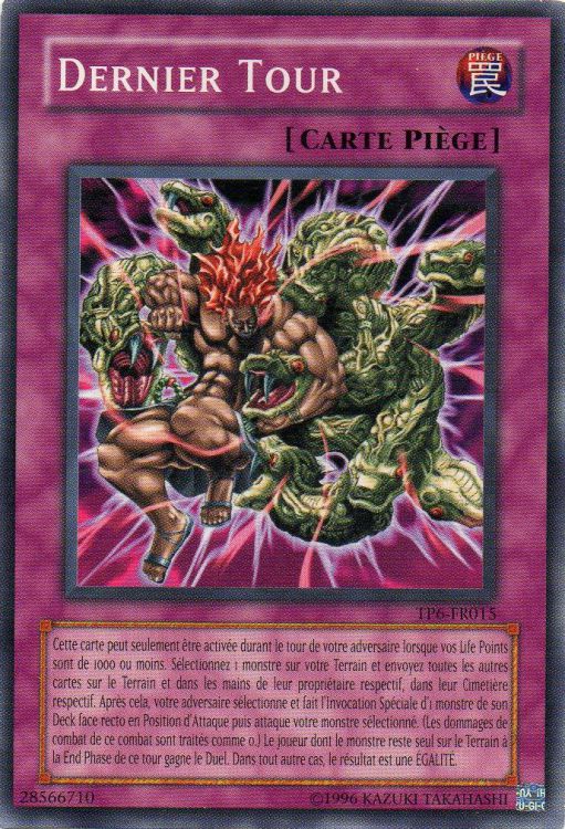 Cette carte ne peut être activée que pendant le tour de votre adversaire quand vos Life Points sont de 1000 ou moins. Sélectionnez 1 monstre sur votre Terrain et envoyez toutes les autres cartes du Terrain dans leurs Cimetières respectifs. Votre adversaire doit alors Invoquer Spécialement 1 monstre de son Deck en Position d'Attaque face recto et attaquer votre monstre sélectionné. Tout Dommage de Combat résultant de ce combat est considéré comme nul. Le joueur dont le monstre reste seul sur le Terrain lors de la End Phase de ce tour gagne le Duel.Tout autre cas de figure entraîne un DRAW.