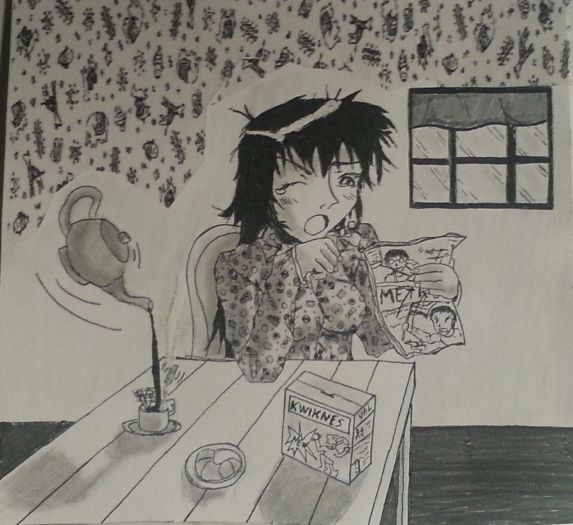 A l’entente de l’appel de sa mère, le ventre de Cid se mit à férocement gargouiller. Il regarda alors son bureau où se trouvait le sandwich de la veille qu’il n’avait pas touché. Cela pouvait lui arriver d’oublier de manger, mais c’était seulement lorsqu’il était pris par un récit qui le captivait et malgré la faim qui le tenaillait il ne voulut pas de cela comme premier repas de la journée. Il sortit donc de sa chambre pour descendre dans la cuisine où l’attendait sa mère ainsi qu’un bon petit déjeuner, enfin c’est ce qu’il espérait tout du moins. Après être rentré dans la pièce il fit une bise à sa mère, une belle femme rousse aux yeux verts éclatant approchant de la cinquantaine, puis il prit place sur une chaise devant laquelle se trouvait son bol de cacao ainsi que ses tartines de confiture soigneusement préparées.