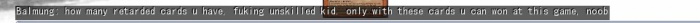 Les joueurs sont mauvais que ce soit dans la communauté et dans le niveau mais d'un point, il y a un gars qui joue Potartiste ET PERDS CONTRE BETE GLADIATEUR 0-4, dès que tu entres là bas et que par malheur tu as un comportement "différent" que ces *** ils te regardent comme si t'étais relou, donc pas possible de s'entendre quand tu ne les connais pas bien et ce qui m'énerve parmi eux c'est qu'ils n'ont absolument pas compris que yugioh n'est pas que de la chance, un gars de là bas avait un deck Magicien Yeux Impairs fait 0-3 à un WCQ et me dit que ses mains étaient mauvaises, c'est plutôt lui qui est mauvais. Les nouveaux qui souhaitent investir ne peuvent absolument pas devenir des joueurs de compétition dans cette environnement.